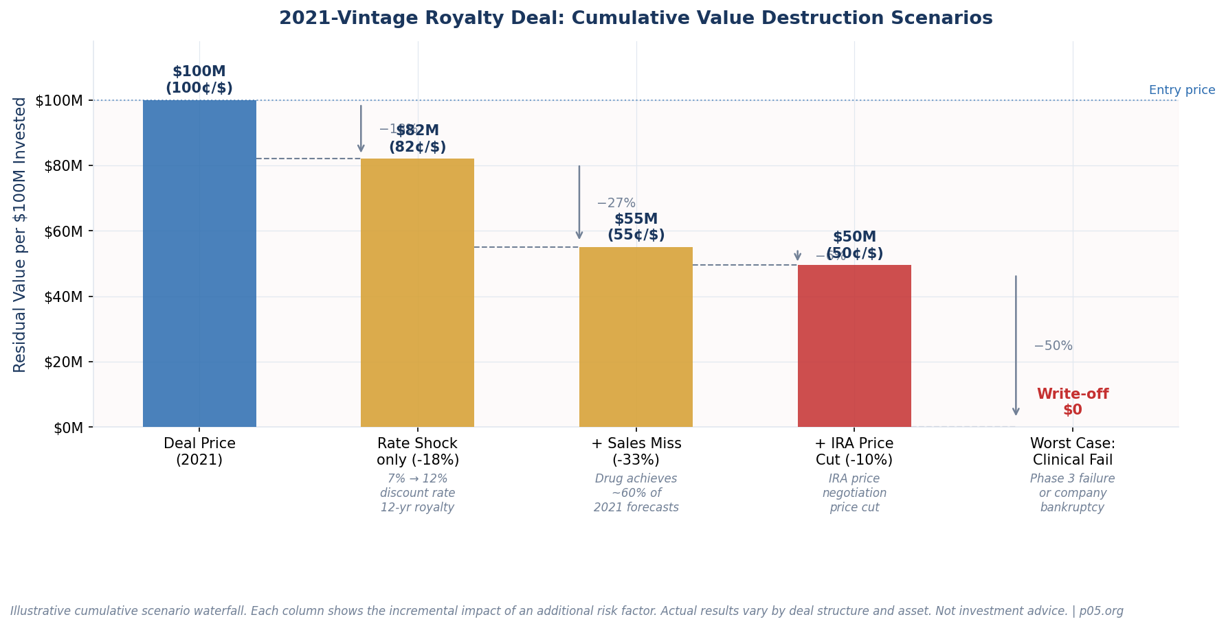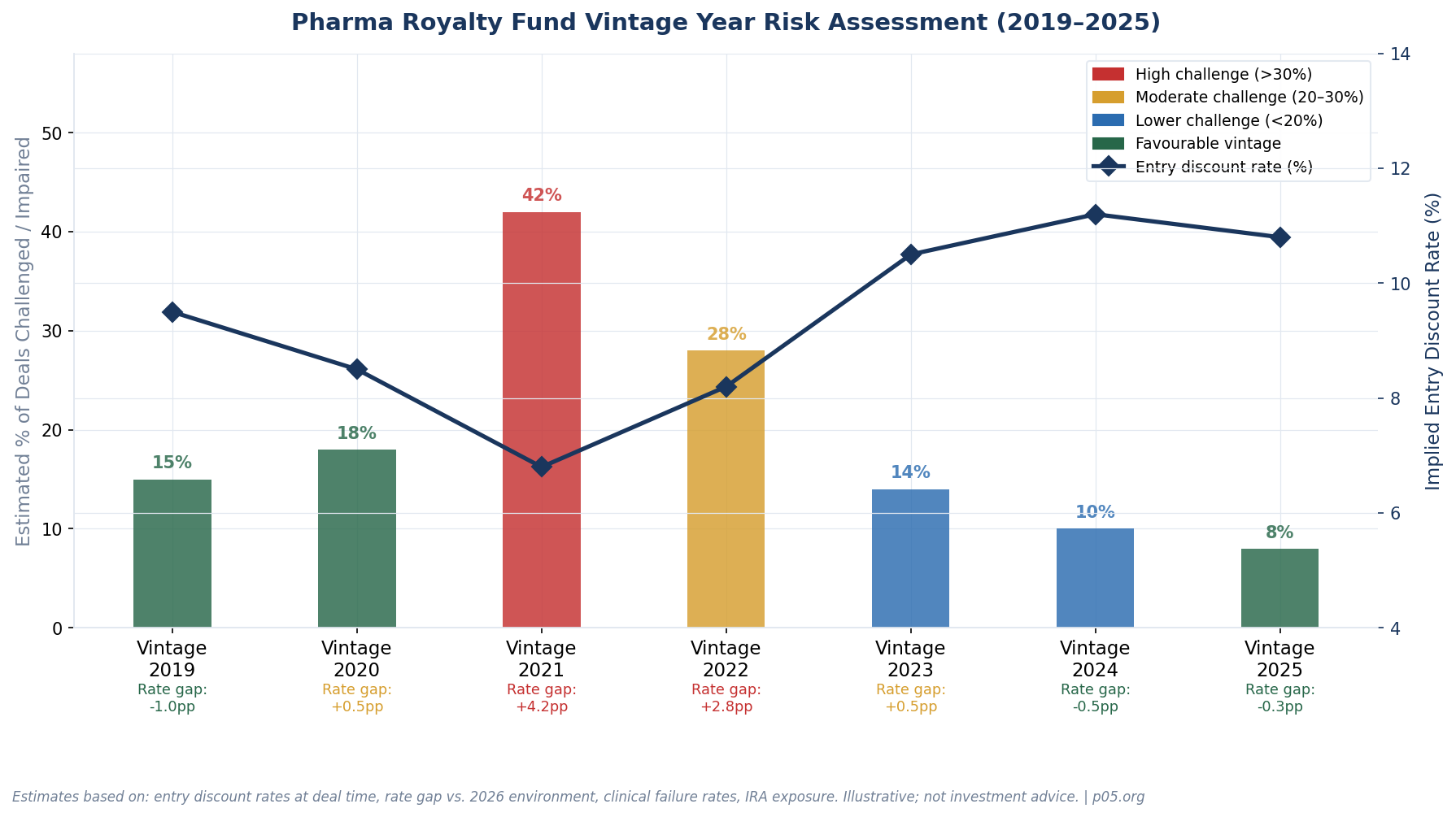 The 2021 cohort carries the confluence of every headwind simultaneously. Entry discount rates compressed to 6–7%, biotech valuations were at peak, new competition flooded the market, IRA risk was not yet priced in, and the rate cycle was about to inflict maximum damage on long-duration assets. Our estimate is that roughly 40% of major 2021-vintage royalty deals face some form of material impairment — either mark-to-market losses on rate repricing, commercial underperformance, clinical failure, or IRA-driven revenue ceiling effects.