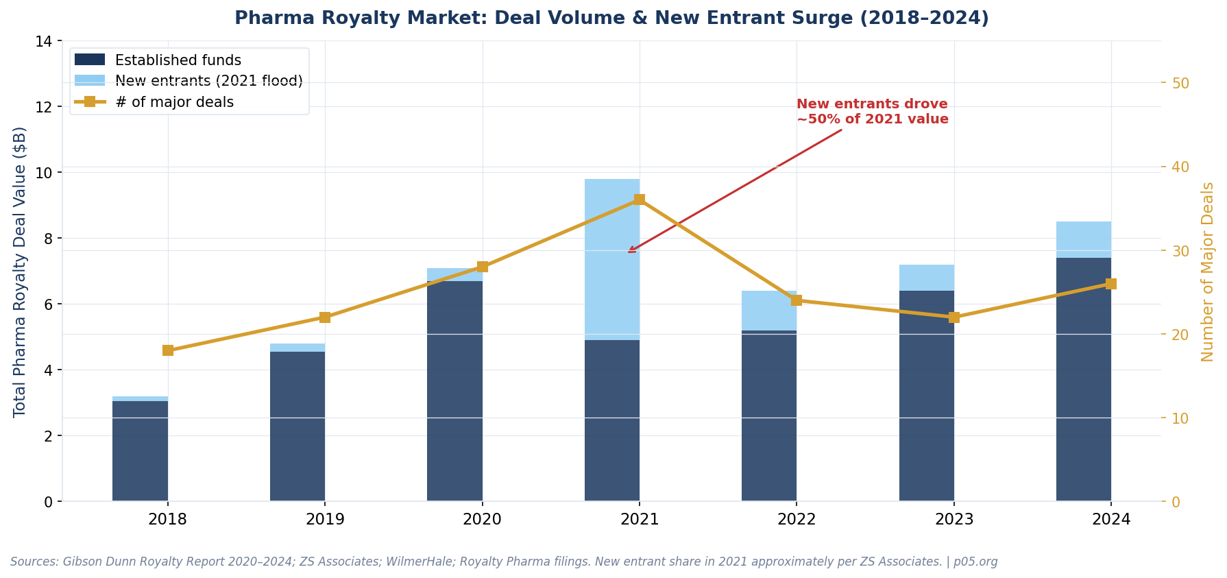 Royalty deal volume is estimated at around $14 billion annually as of 2024, driven by the continued difficulty biotech companies face in accessing equity and IPO markets. The deals being struck now are being written at entry rates of 10–12%, against conservative revenue forecasts shaped by 2021's sobering lessons. IRA pricing uncertainty is now modeled explicitly. The 2024–2025 vintage represents, in many ways, the mirror image of 2021: disciplined entry conditions, a realistic rate environment, and sellers who are negotiating from a weaker position. Royalty Pharma's 2024 Investor Day reported that over 90% of transactions since 2020 exceeded their approximately 7% cost of capital on a portfolio basis — but that figure will be skewed heavily toward the most recent and best-structured deals.