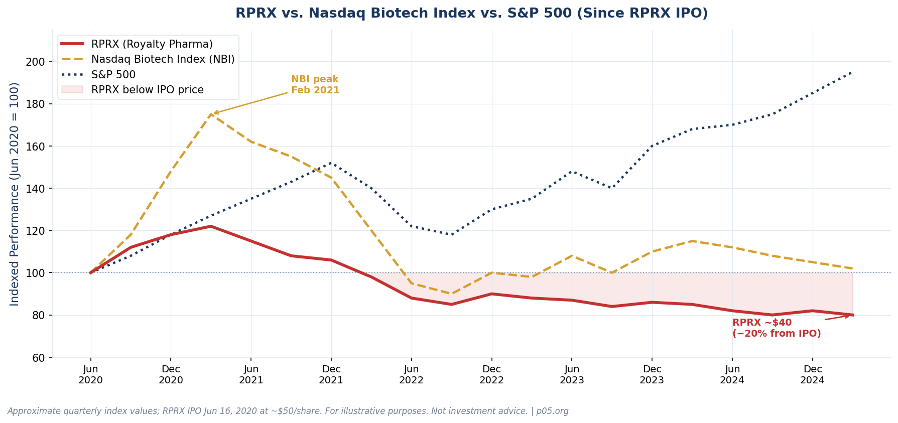 RPRX priced its IPO at approximately $50 per share in June 2020. As of early 2026 it trades near $40 — approximately 20% below the IPO price. Yet the underlying cash flow engine has been growing throughout. Annual Portfolio Receipts tell the story of a business performing operationally while the equity market prices it at a higher cost of capital: