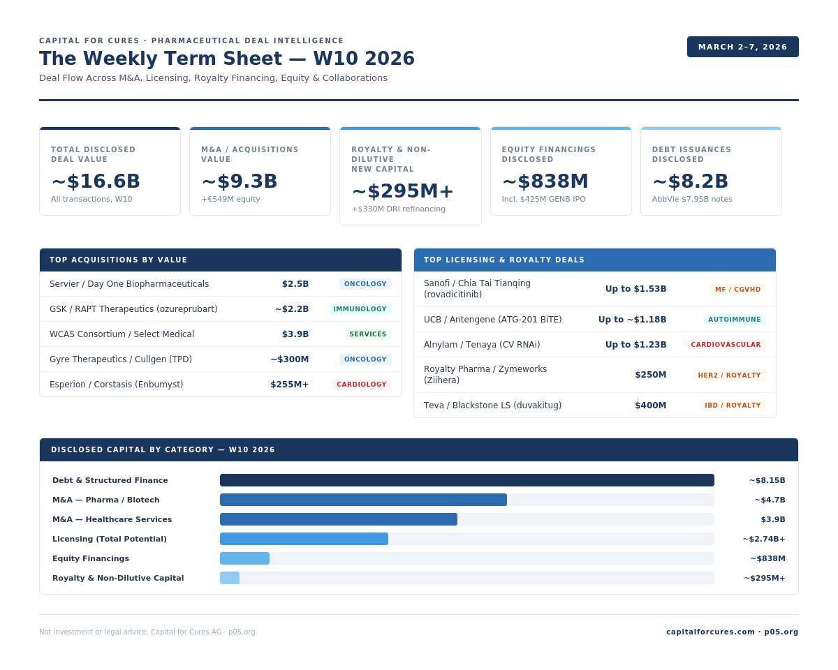 Week in Numbers: $16.6B total disclosed value, $9.3B M&A, $295M+ royalty and non-dilutive capital, $838M equity financings, $8.2B debt issuances