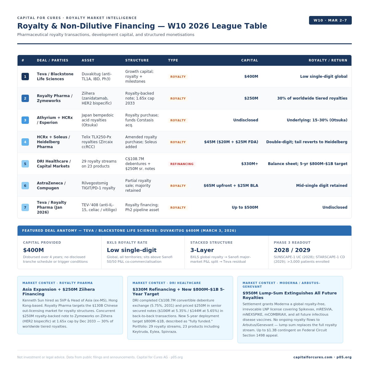 Week 10 produced two transactions with direct implications for the pharmaceutical royalty and financing ecosystem: AstraZeneca's royalty monetization with Compugen for rilvegostomig surfacing in earnings disclosures, and Teva's $400M strategic growth capital agreement with Blackstone Life Sciences for duvakitug — the week's most direct example of a dedicated life sciences royalty investor providing development capital in exchange for a future royalty interest. Together they illustrate two sides of the royalty deal spectrum: monetising receivables during Phase 3, and creating new royalty obligations to fund pipeline advancement.