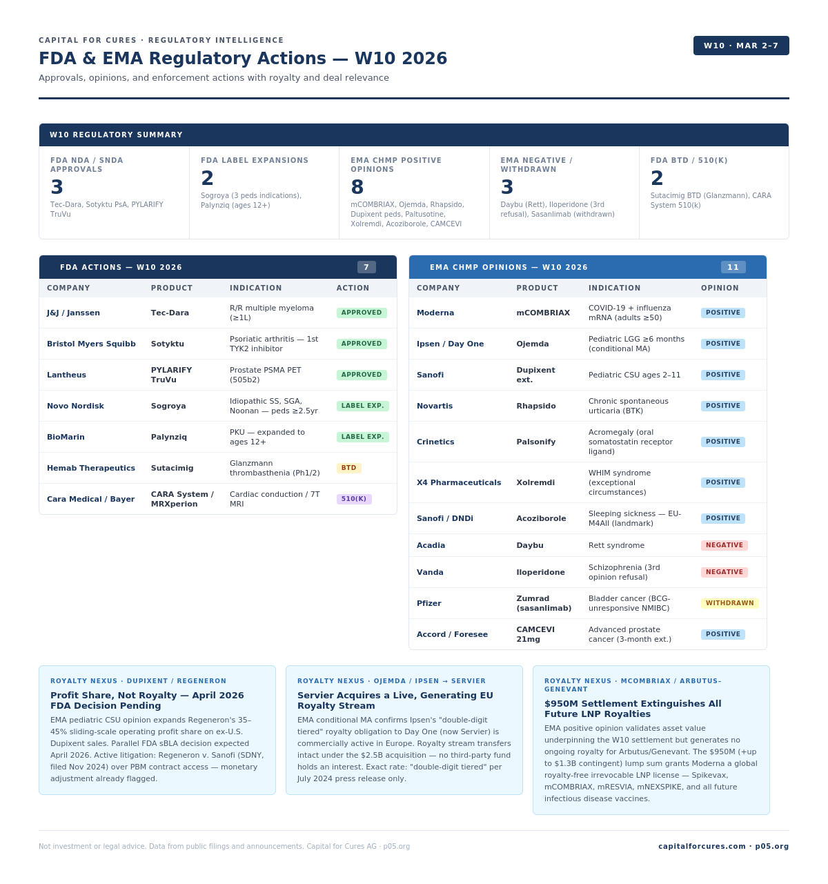 FDA and EMA Regulatory Overview: 3 FDA approvals, 2 label expansions, 8 EMA positive opinions, 3 EMA negative/withdrawn, 2 FDA BTD/510k)