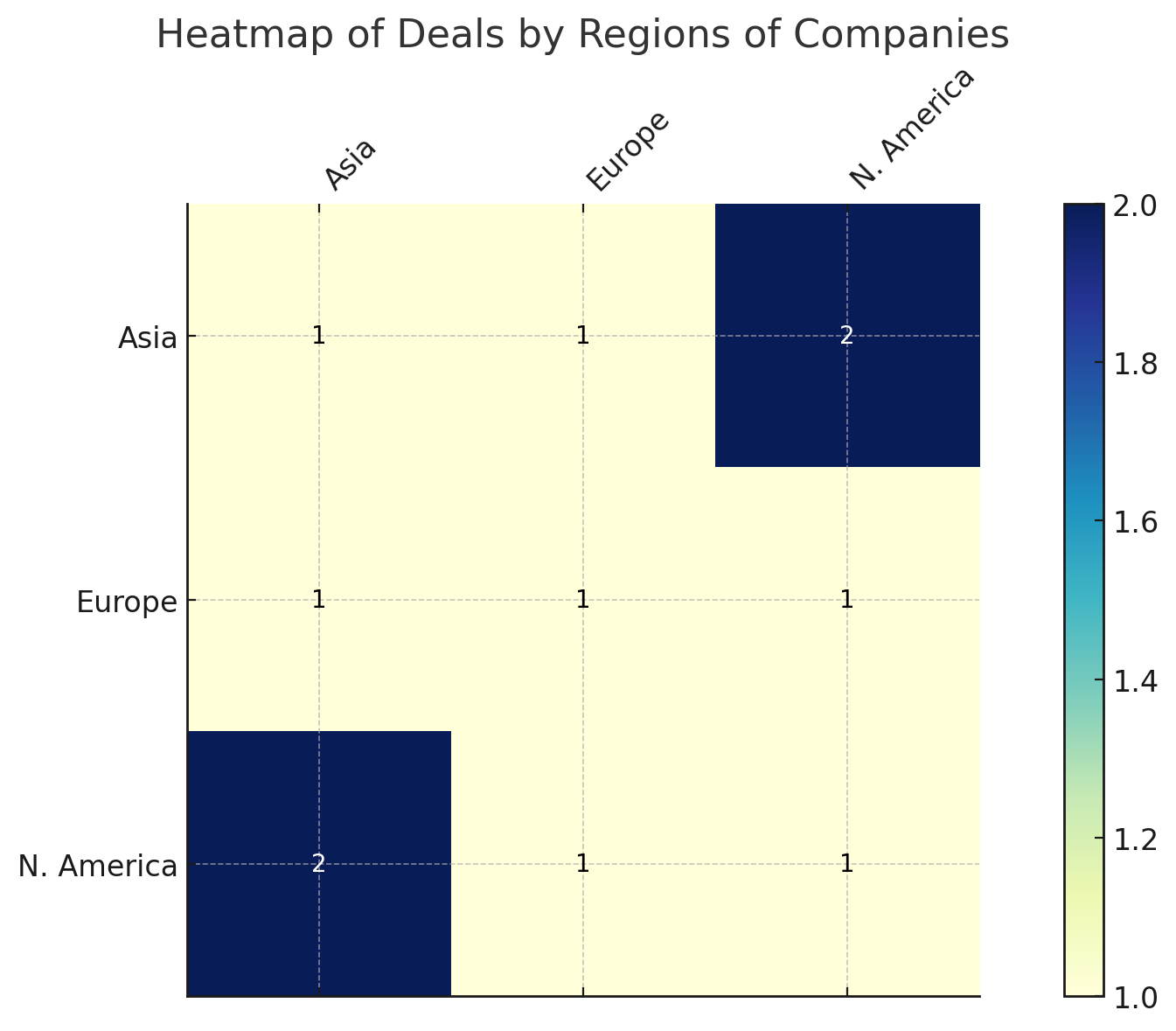 Figure 1: Heatmap of deal activity by geography (July 14–21, 2025). Each cell shows the number of deals involving companies from the corresponding regions. Cross-border deals dominated, with particularly active links between Asia and North America.