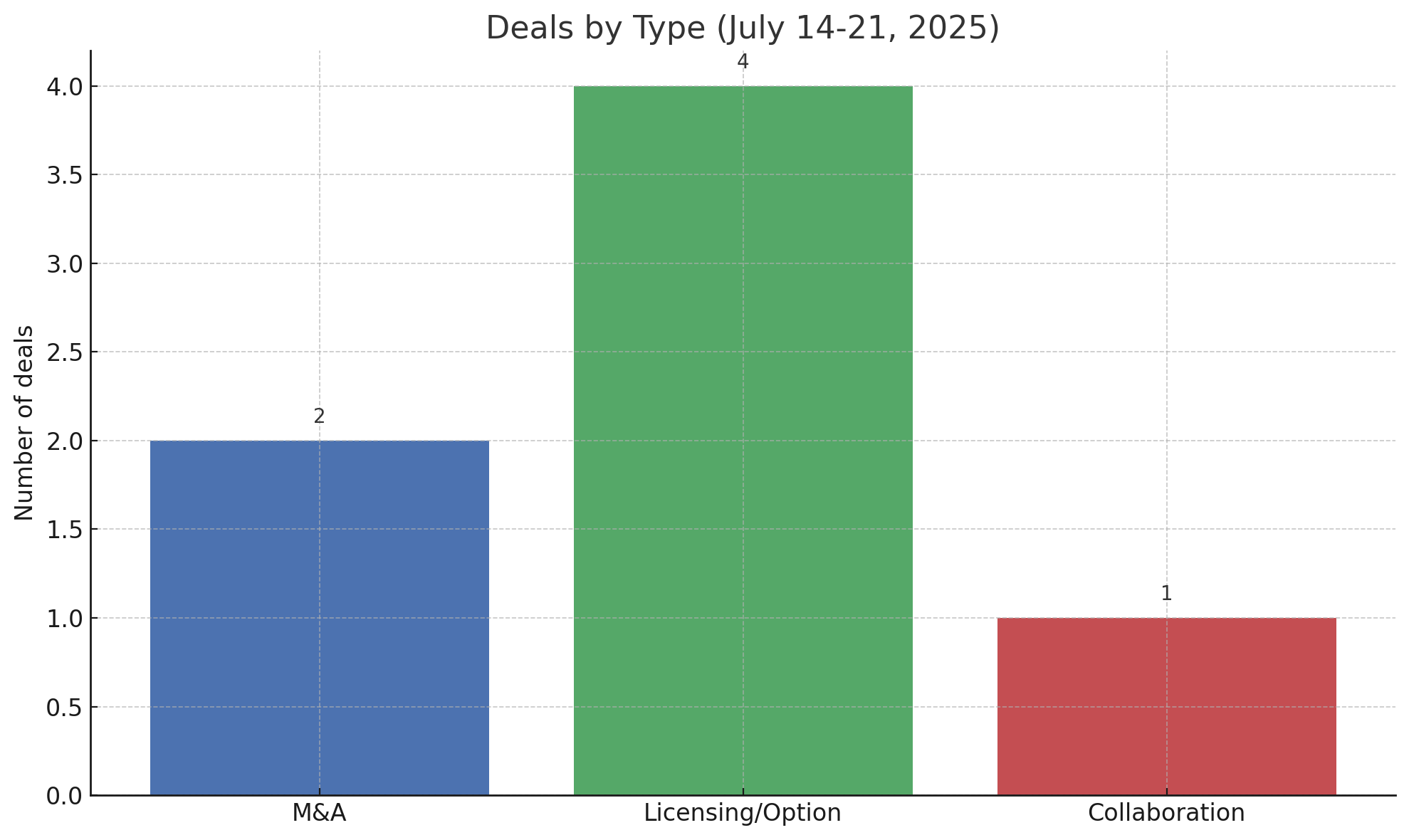 Figure 2: Number of deals by type (week of July 14–21, 2025). Licensing/option agreements dominated the week’s deal activity, outnumbering outright M&A transactions, with a smaller portion of pure R&D collaborations. This indicates a strategic preference for risk-sharing partnerships during the period.