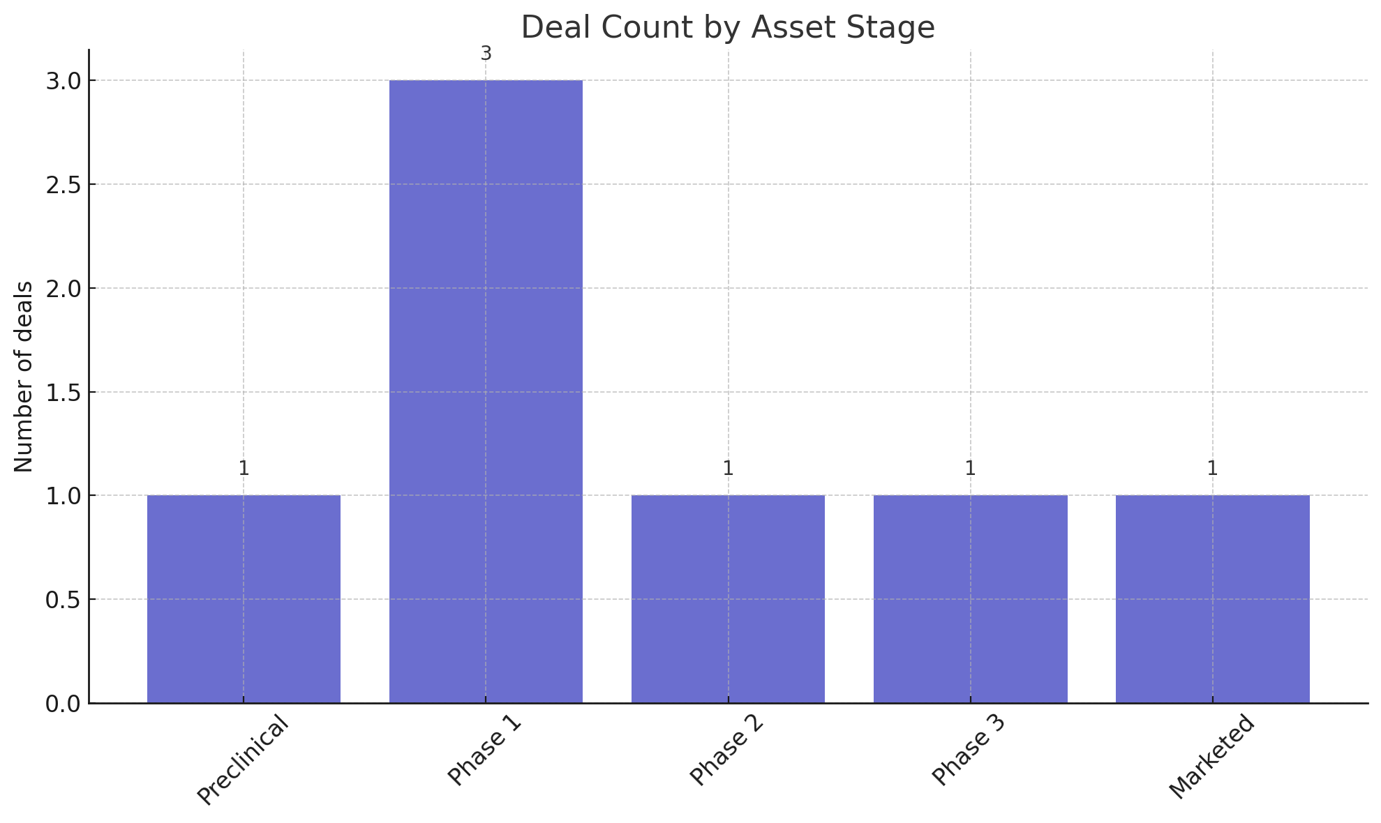 Figure 3: Deal count by asset stage. Transactions during the week involved assets across development stages, with Phase 1 programs constituting the largest share. This reflects robust deal activity even at early stages of R&D, as companies position themselves for long-term payoffs. Later-stage and commercial assets, while fewer in number, commanded significant attention and value.