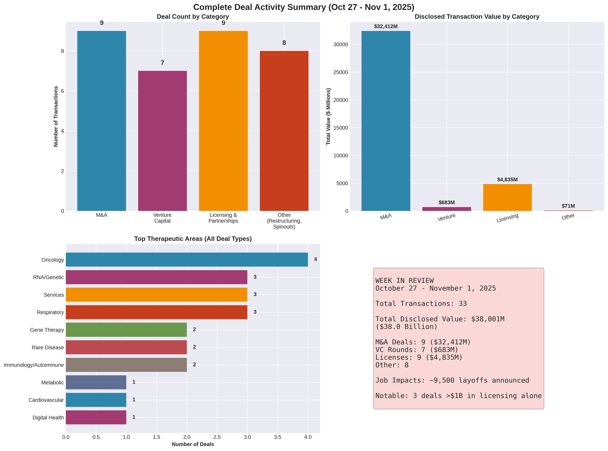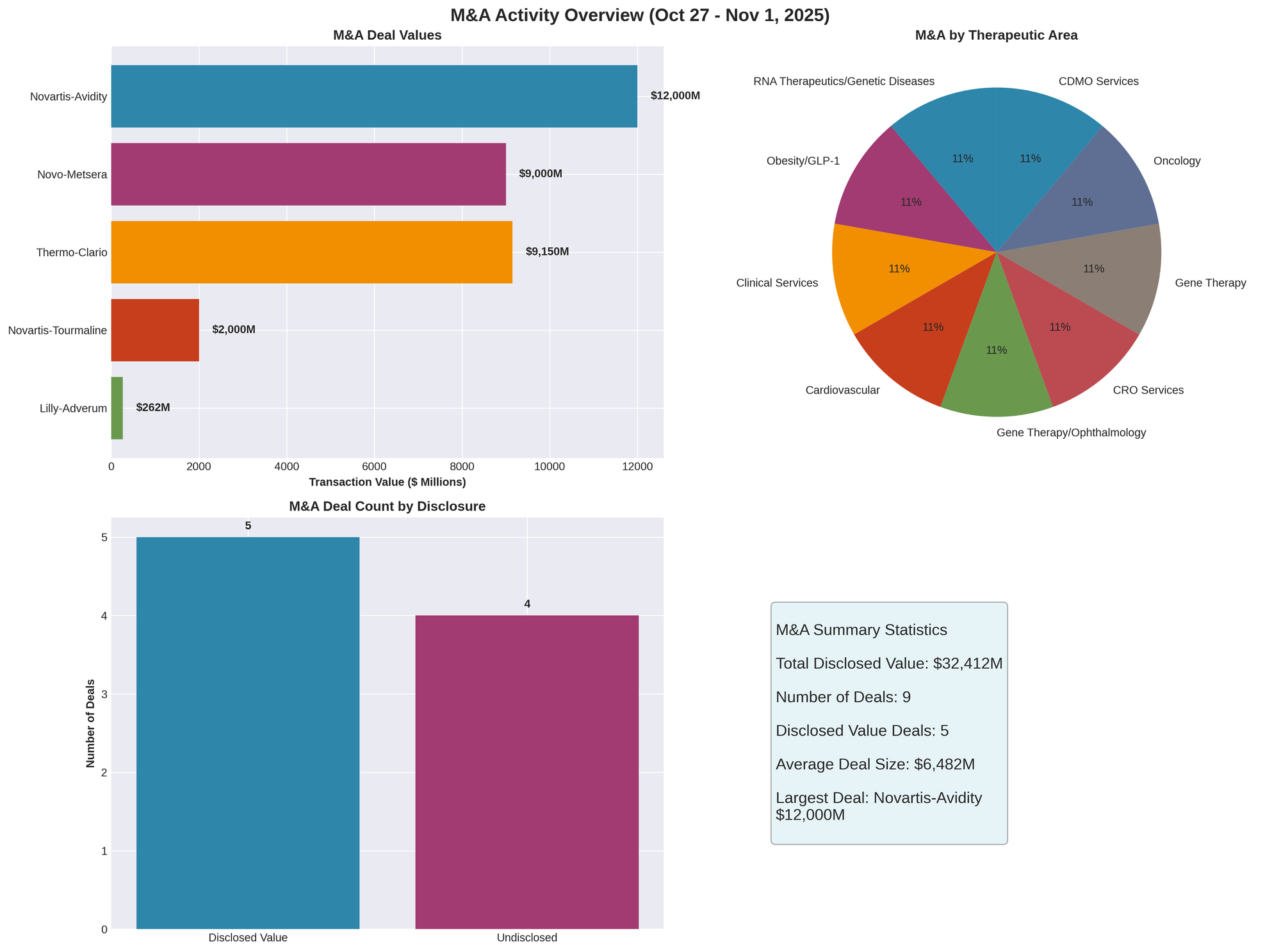 Figure 1: M&A transaction values, therapeutic area distribution, and deal summary statistics for October 27 - November 1, 2025