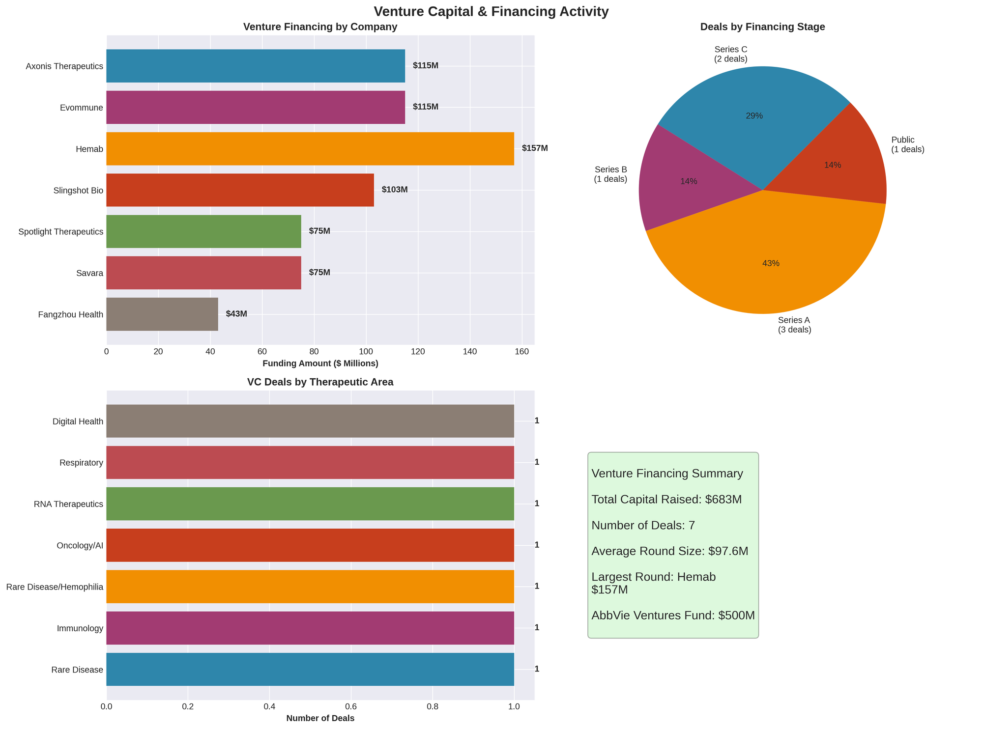 Figure 2: Venture capital funding by company, financing stage distribution, therapeutic focus, and summary statistics