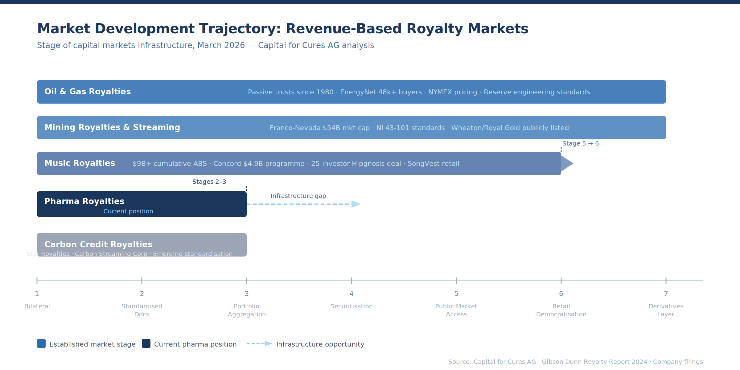 Carbon credits are at stage 2–3. Pharmaceutical royalties are between stages 2 and 3: the bilateral transaction market is established at $5+ billion annually, standardised documentation is emerging through legal surveys (Covington, Gibson Dunn, Goodwin), and portfolio aggregation exists through Royalty Pharma and HealthCare Royalty but has not yet produced new tradeable securities.