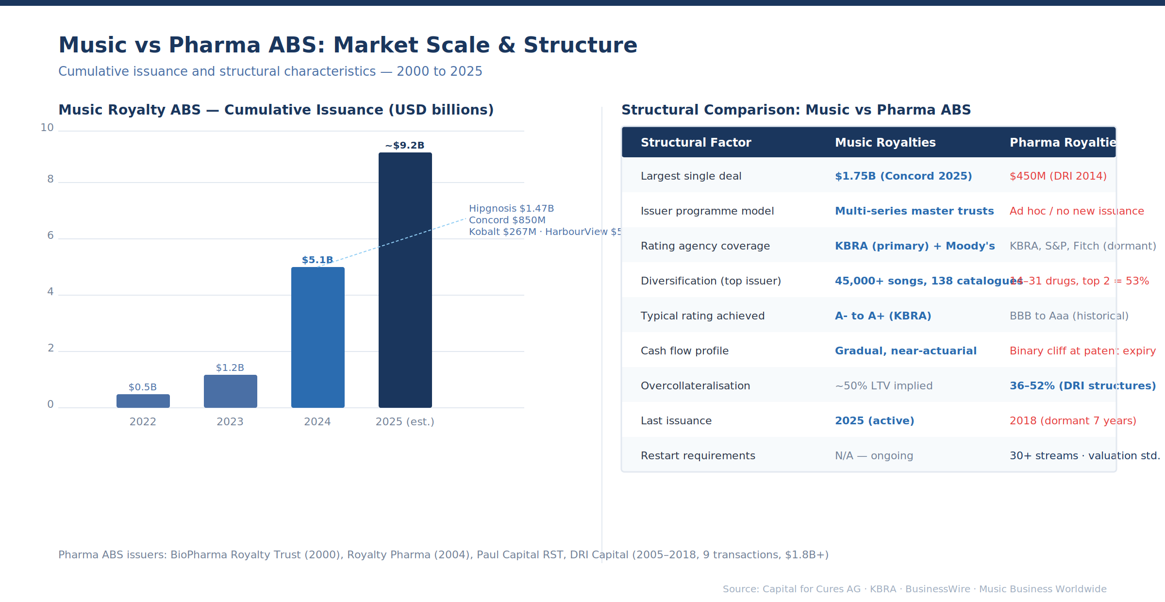 Two markets. Comparable scale. Fundamentally different capital markets architecture. The music industry has built a full securitisation infrastructure — programmatic issuance, master trust structures, KBRA rating coverage, repeat institutional investor bases, and growing secondary market liquidity. The pharmaceutical royalty market has one company with investment-grade corporate bonds and a dormant ABS programme that last issued in 2018. Everything else is bilateral.