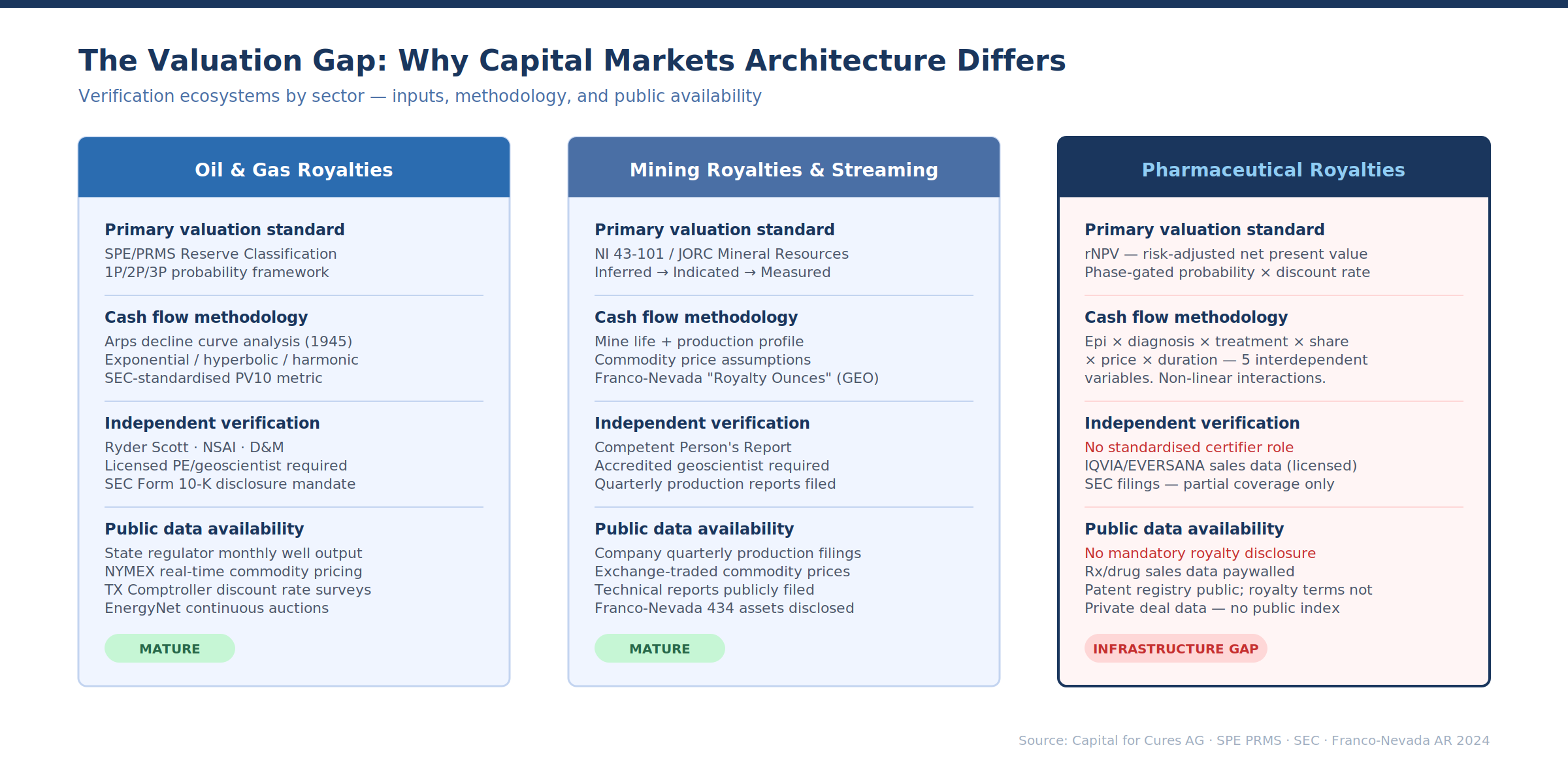 The gap between oil & gas and pharma royalty markets is not just about valuation methodology. It is about the entire ecosystem of verification that sits around it — and that ecosystem took decades and hundreds of billions of dollars in transaction volume to construct.